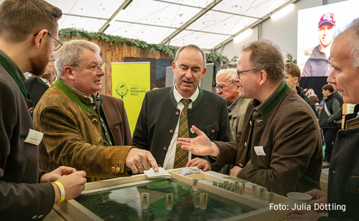 An den dafür eigens vom LJV kreierten „Kommunikationstischen“ konnten die Besucher auf verschiedenen Revierkarten ihre Reviere darstellen. Das für und wider der auf der Karte platzierten magnetischen Kanzeln, mobilen Ansitzeinrichtungen, Schwerpunktbejagung- und Ruhebereichen sorgte für viele „Aha“-Momente und ein durchweg positives Feedback für diese neue Interaktionsmöglichkeit.
