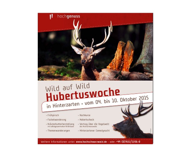 Unter dem Motto "Wild auf Wild" veranstaltet die Hochschwarzwald Touristik GmbH (HTG) die diesjährige Hubertuswoche vom 04. bis 10. Oktober 2015 in Hinterzarten. Die Themen Wild, Natur und Jagd stehen im Mittelpunkt und viele unserer Förster und Jäger des Hegerings Hinterzarten-Breitnau-St. Märgen wirken mit. Am 4. Oktober gestalten die Jagdhornbläser St. Märgen zusammen mit dem Männergesangverein St. Märgen die Euchariistiefeier in Hinterzarten um 10:30 Uhr mit ihrer Jagdhornmesse mit.