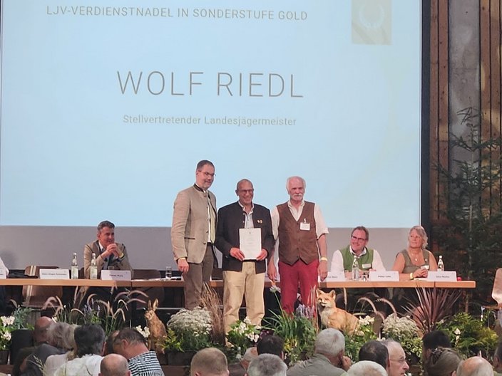 Auch auf dem Landesjägertag in Ulm wurde unser vorheriger Kreisjägermeister Wolf Riedl für seine langjährige Tätigkeit als Kreisjägermeister und stellvertretender Landesjägermeister mit der LJV-Verdienstnadel in Gold geehrt (Bild von Mario Gehring).