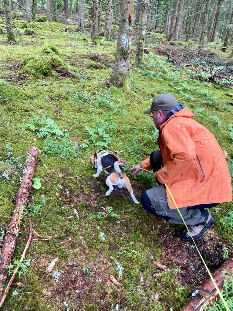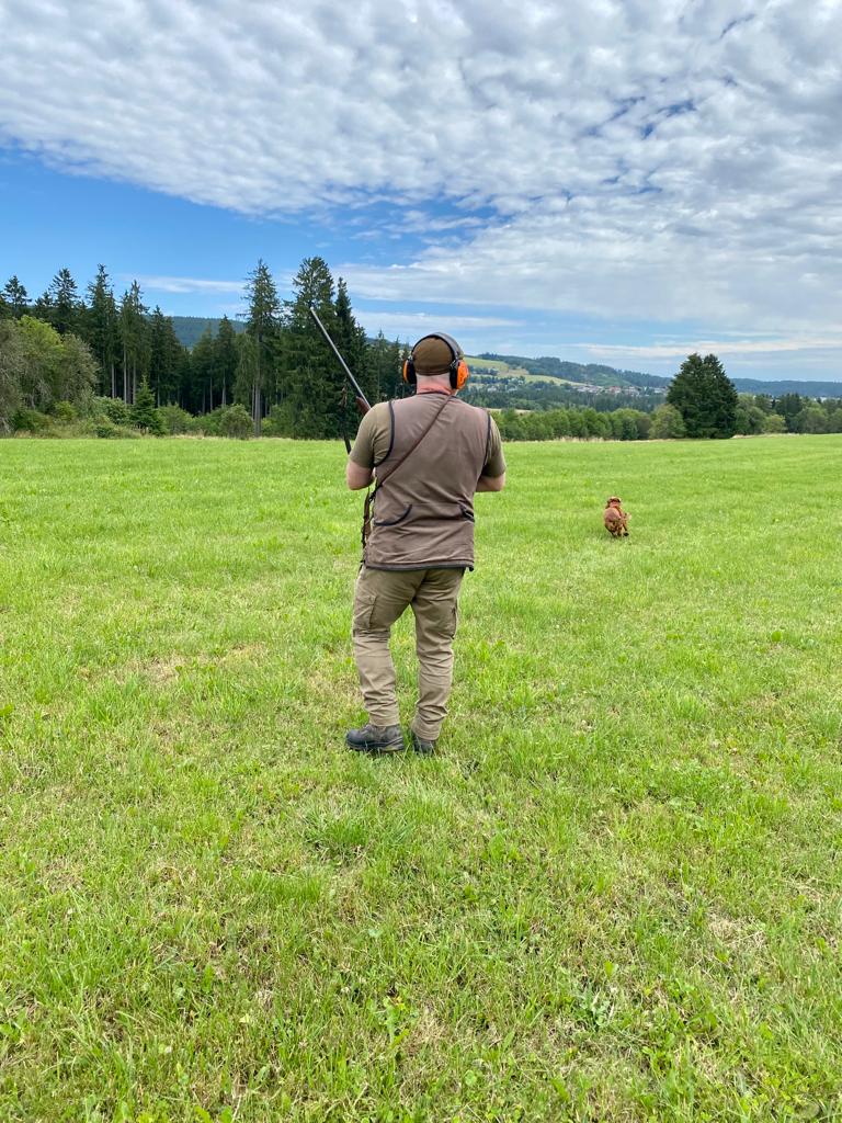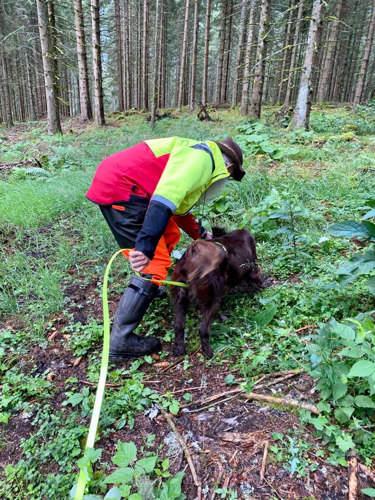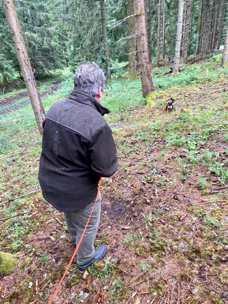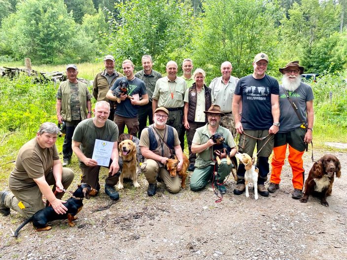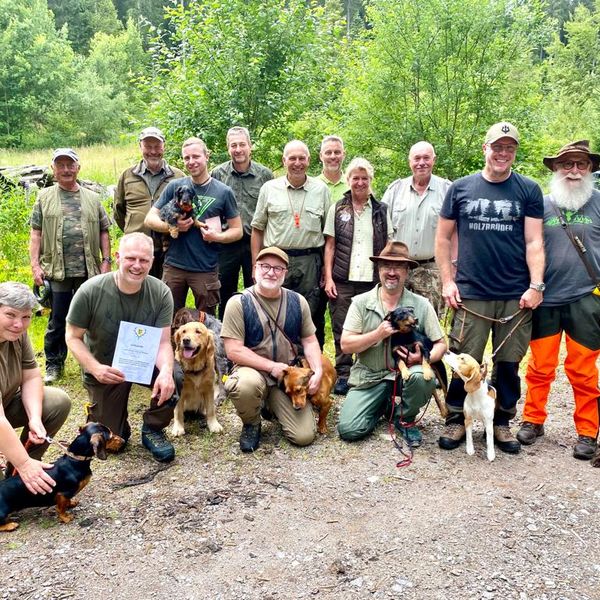 Am 8. Juli 2023 traten sechs motivierten Hundegespanne zur Brauchbarkeitsprüfung in Lenzkirch an. Wie schon zu Beginn des vorangegangenen Kurses regnete es in Strömen, was sich aber für die spätere Schweissarbeit als durchaus vorteilhaft herausstellte. Die Gespanne - Golden Retriever, Dt. Wachtel. Dt. Jagdterrier, Beagle, Schwarzwälder Bracke und Alpenländische Dachsbracke wurden im vorangegangenen Kurs durch Hundeobmann Matthias Loose, unterstützt von Hartwig Frank, hervorragend vorbereitet und eingestimmt. Die Richtergruppe mit Prüfungsleiter Hartwig Frank, Obfrau Ilona Eckert und Wolf Riedl zeigte sich beeindruckt ob der gezeigten Leistungen. Alle Prüfungsfächer gemäß Jagdliche Brauchbarkeit 1.1 wurden mit Bravour absolviert. Ein Gespann absolvierte auch Teil 1.2 für den Einsatz im Feld.