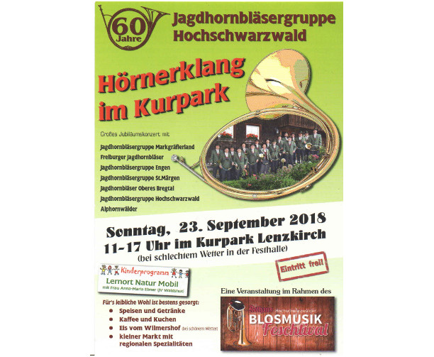 Am 23. September 2018 feiert die Jagdhornbläsergruppe Hochschwarzwald ihr 60-jähriges Jubiläum im Kurpark von Lenzkirch von 11-17 Uhr mit einem großen Konzert zusammen mit den Jagdhornbläsern aus dem Markgräfler Land, Freiburg, Engen, St- Märgen und dem Oberen Bregtal sowie den Alphornwäldern.