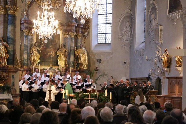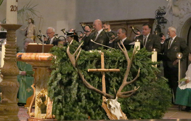 Nach der Begrüßung durch Pfarrer Klemens Armbruster, welcher sich über die große Besucherzahl sehr erfreut zeigte, wurde mit dem Kyrie, dem Gloria und dem Halleluja die feierliche Messe zu Ehren des Schutzpatrons der Jäger fortgeführt. Der Männergesangverein St. Märgen, verstärkt durch die Männerstimmen des Kirchen-chores St. Märgen, unterstützten die Jagdhornbläser mit den zu den Musikstücken passenden Liedvorträgen.